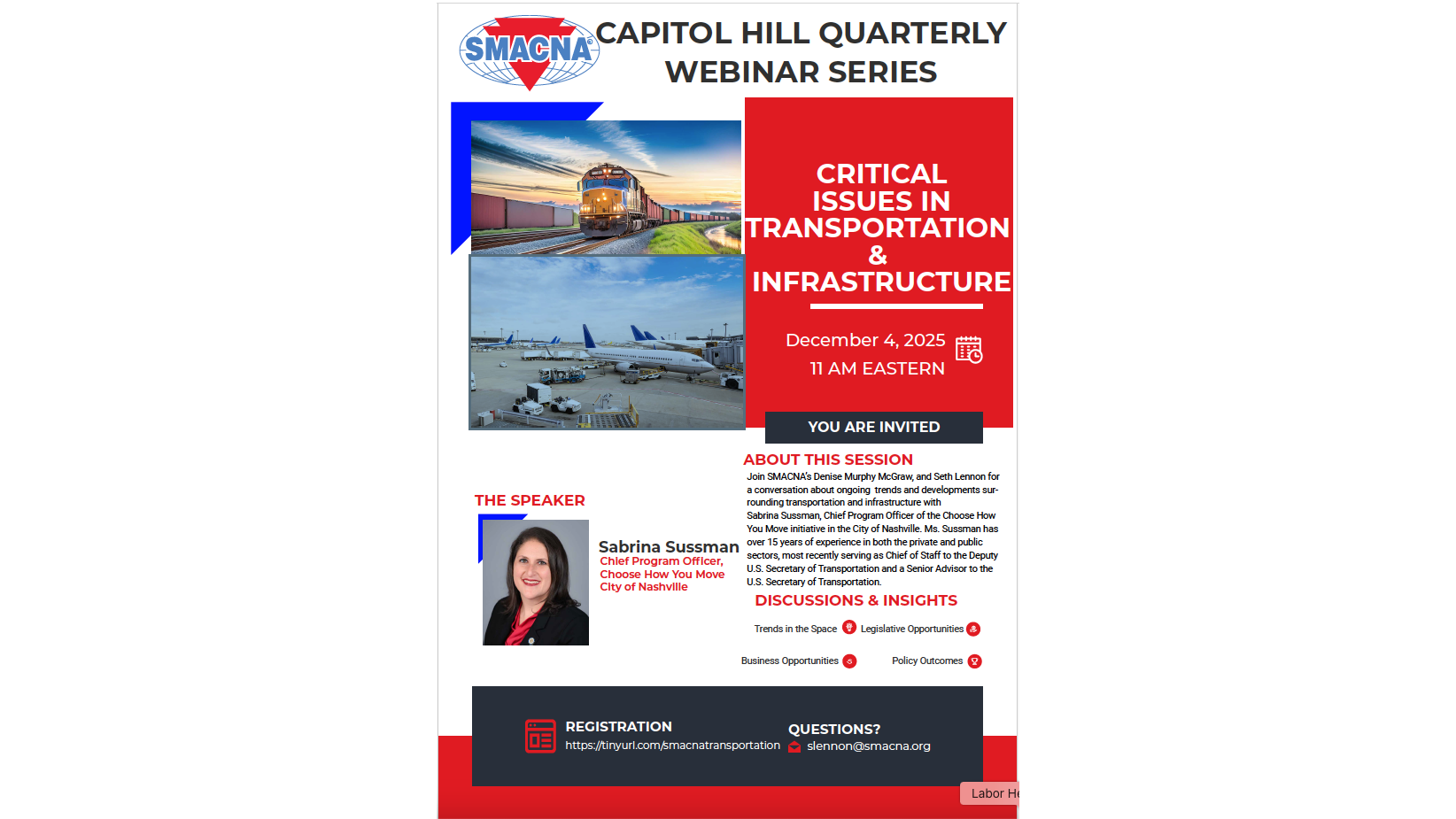 The next entry in SMACNA’s Capitol Hill webinar series features longtime transportation official Sabrina Sussman for a discussion of the critical issues that contractors should be informed of.
