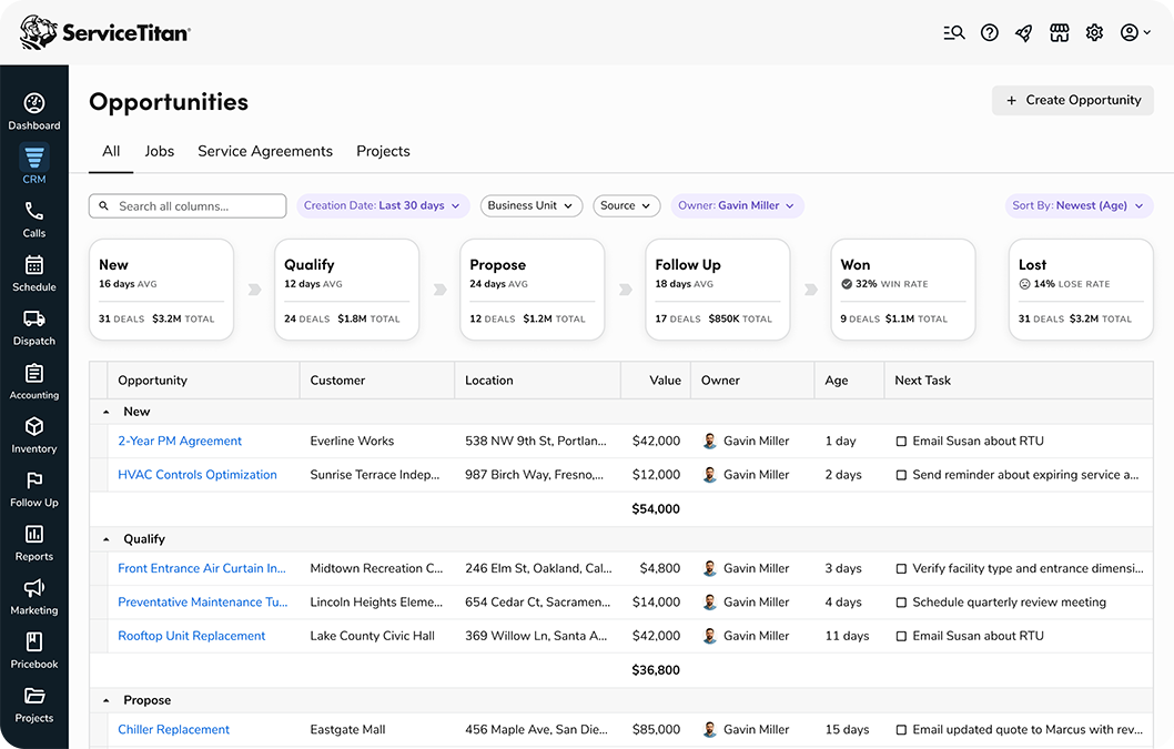 ServiceTitan’s CRM connects every part of your business—helping commercial contractors manage everything from prospects and pipeline to customers and jobs with efficiency and accuracy.