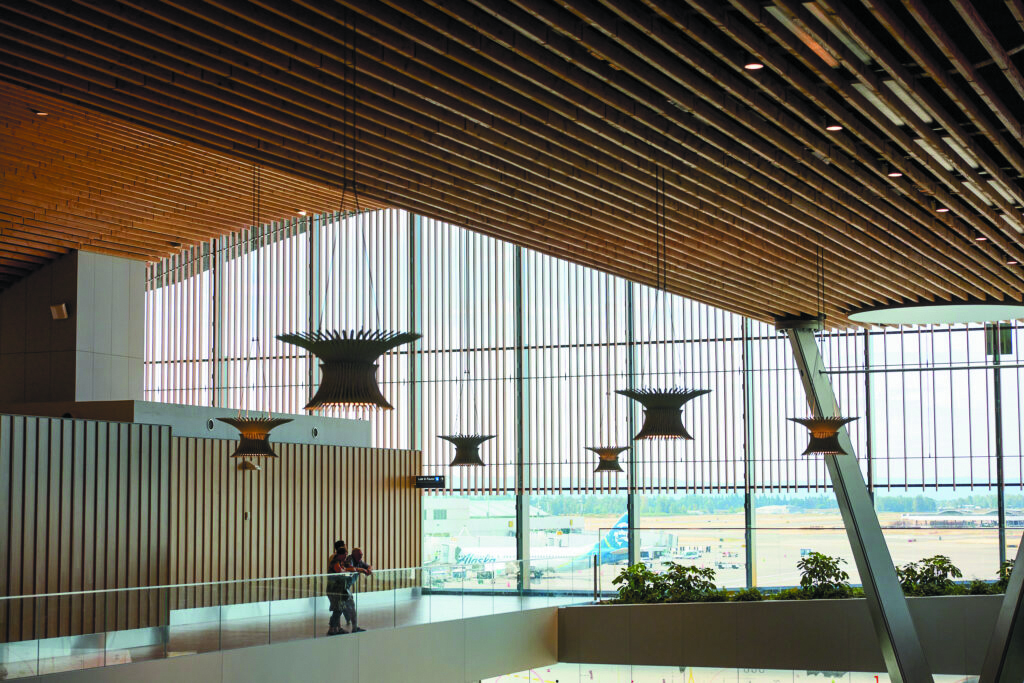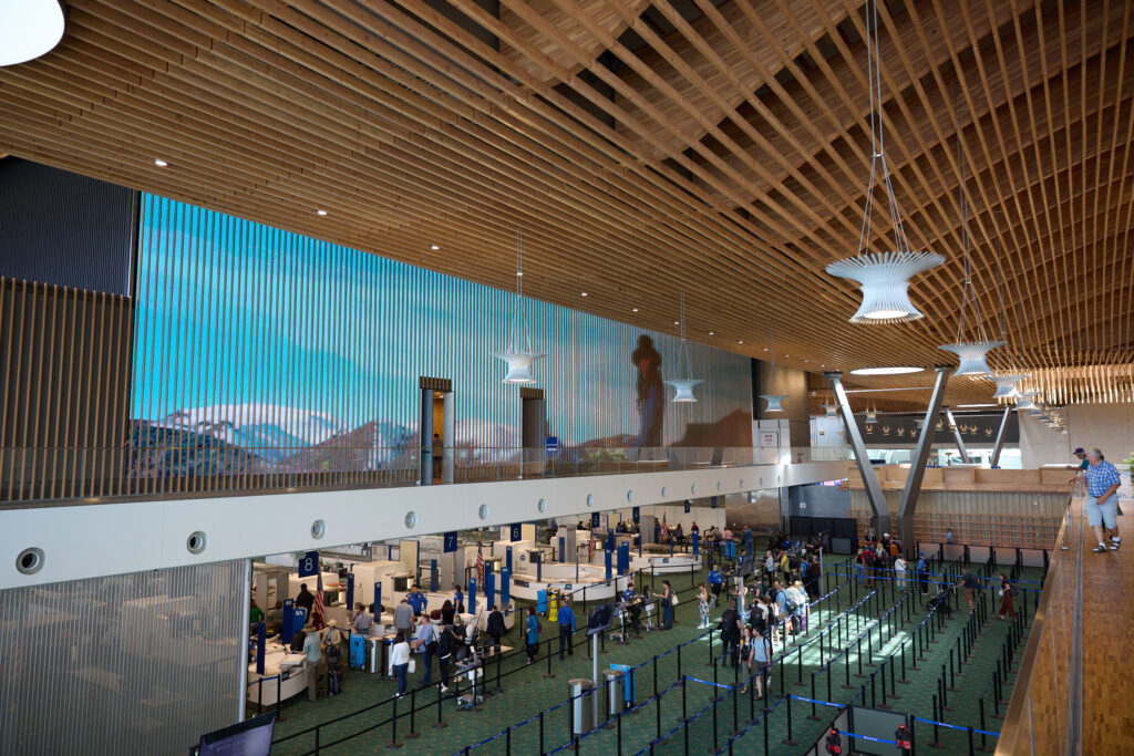 Picture walking through Portland International Airport’s expanded main terminal, dappled light filtering through a 9-acre mass timber roof onto a grove of live trees below just like a Pacific Northwest forest sprouting right over security checkpoints.